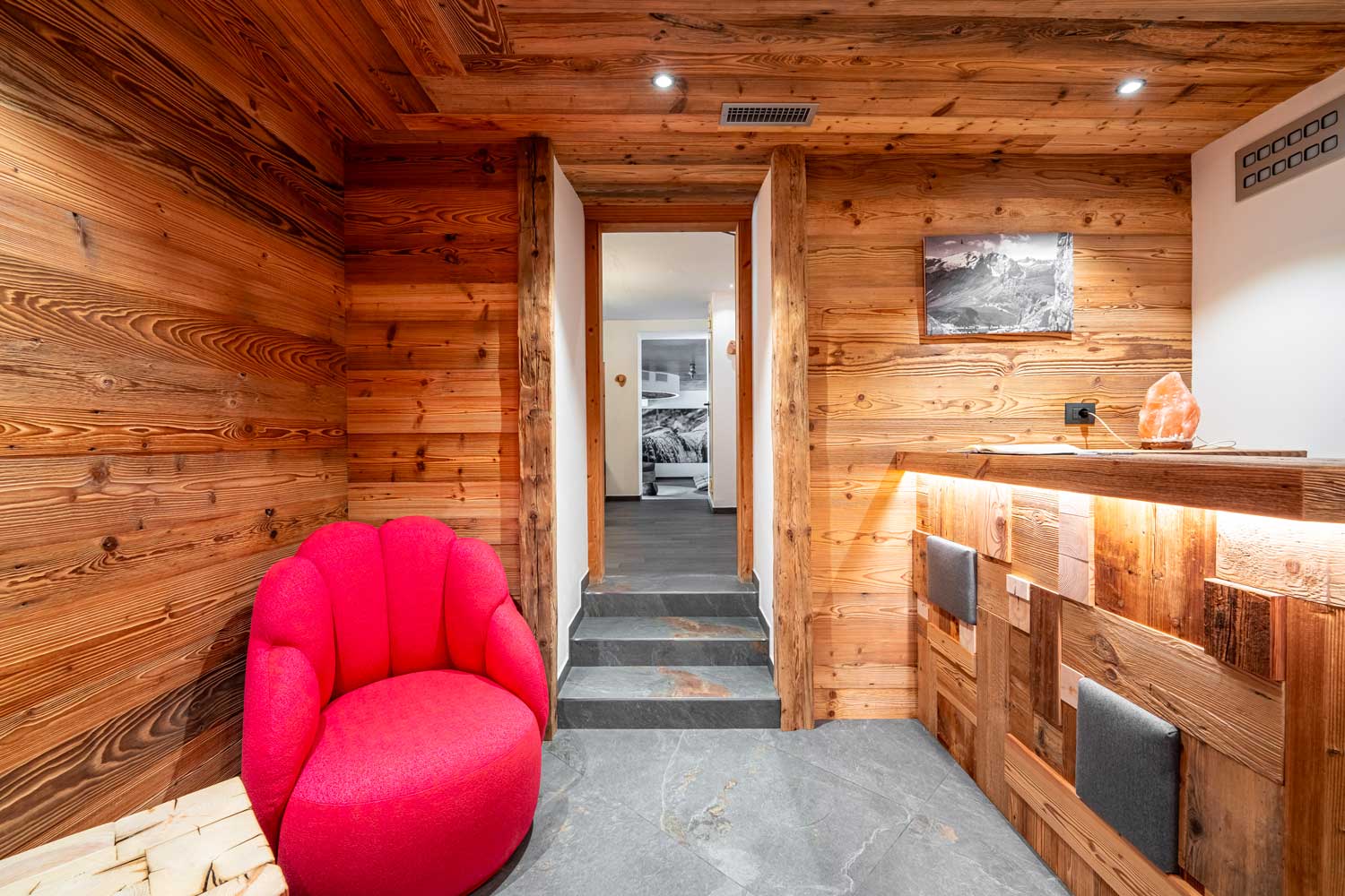 Per il rivestimento abbiamo selezionato un tessuto outdoor nei toni caldi del rosso, arancio e rosa intenso, colori che richiamano i dettagli dei loghi presenti negli asciugamani della spa, creando così un dialogo armonioso con l’identità visiva dell’hotel. La scelta di un tessuto tecnico per esterni garantisce inoltre massima praticità: anche sedendosi con il costume bagnato, gli ospiti possono godere della poltrona senza alcuna preoccupazione.