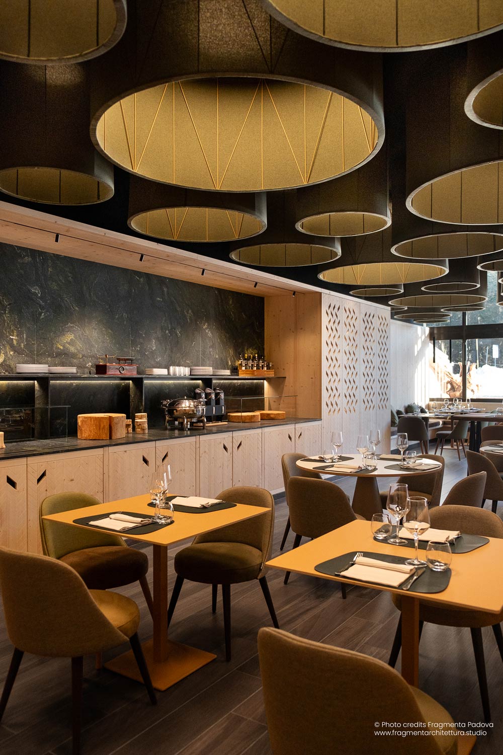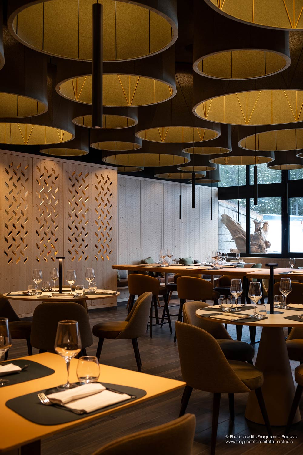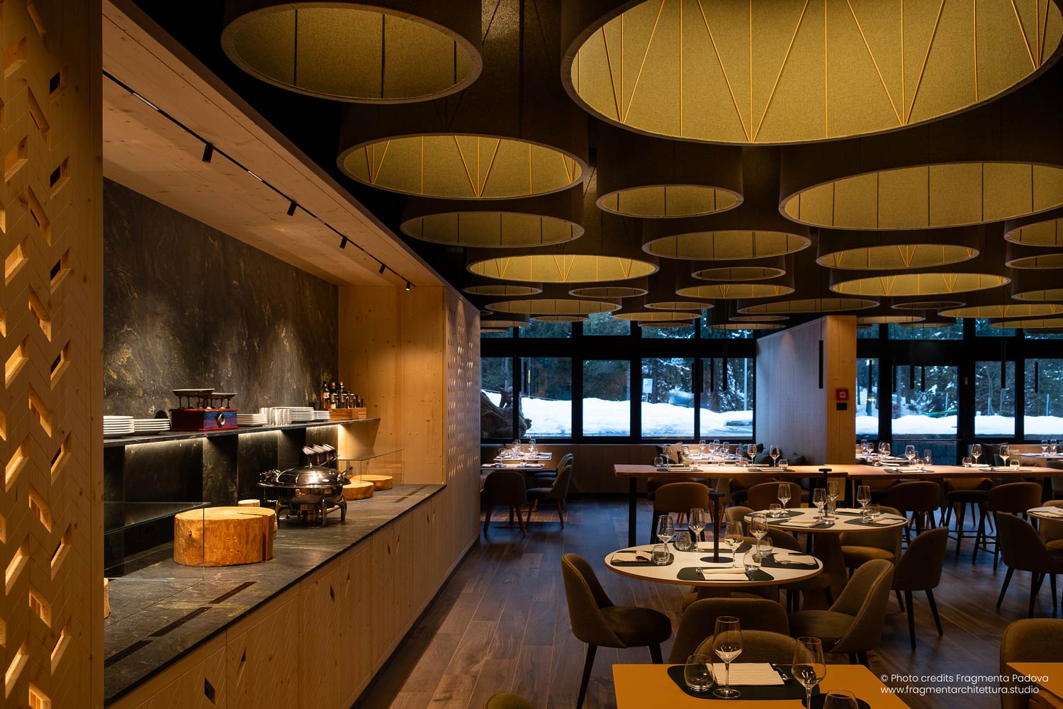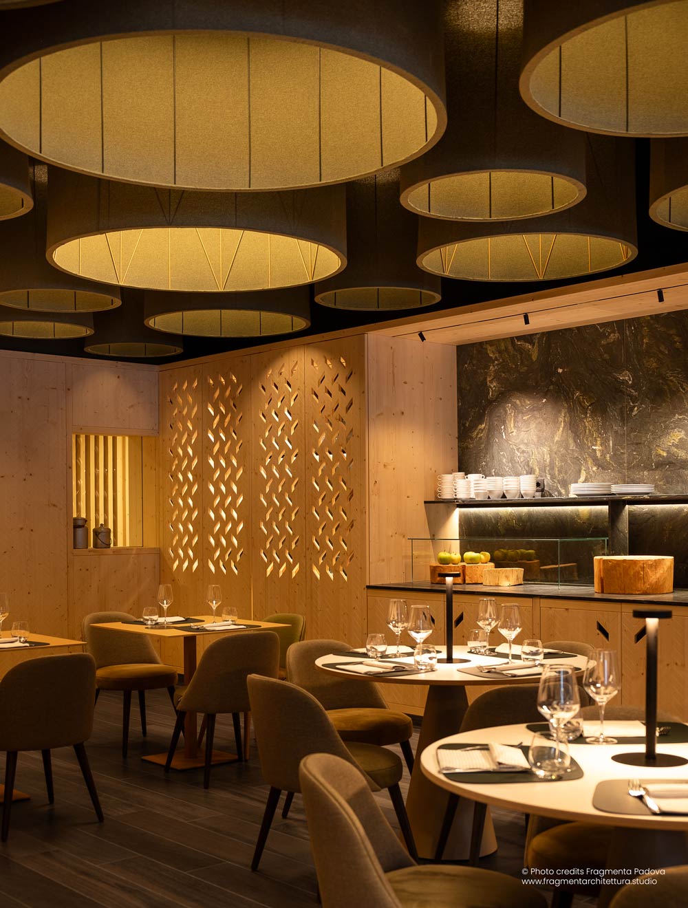 Das Projekt für das Restaurant Lares im Residence Hotel Ambiez in Madonna di Campiglio war eine Herausforderung. Es wurde in enger Zusammenarbeit mit der Architektin Sara Righetto vom Studio Fragmenta in Padua durchgeführt, mit der wir bereits in der Vergangenheit an der Bar- und Rezeptionszone gearbeitet hatten.