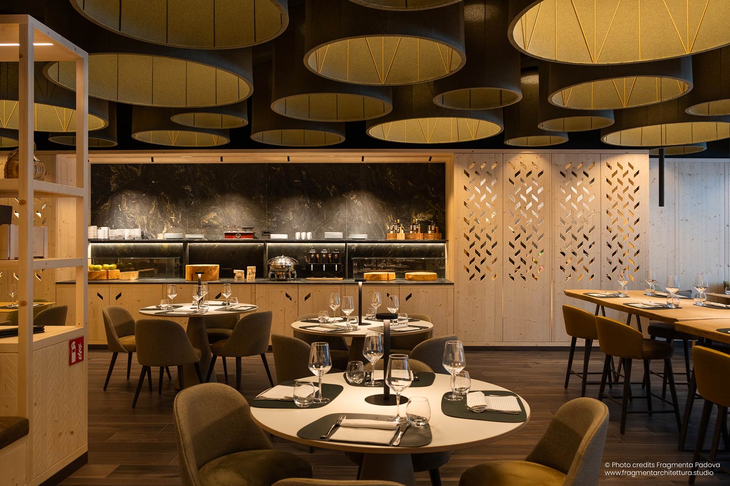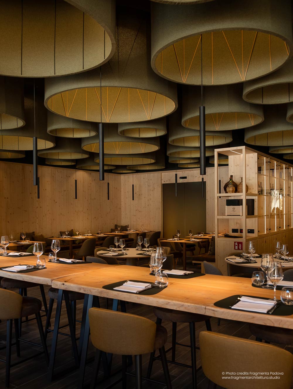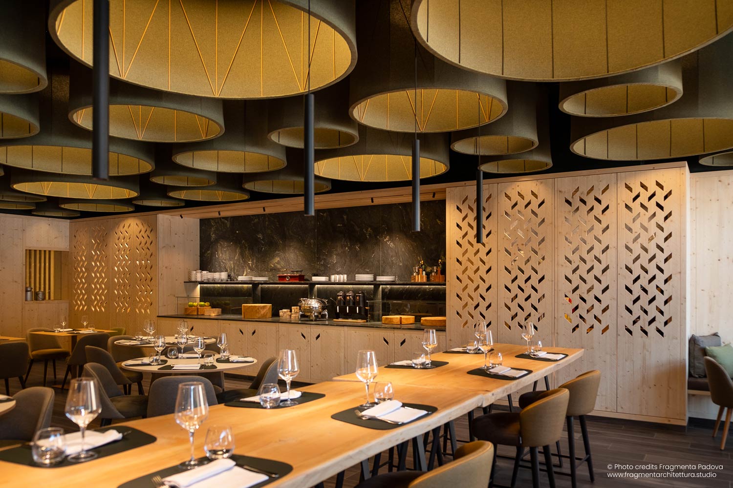 Das Projekt für das Restaurant Lares im Residence Hotel Ambiez in Madonna di Campiglio war eine Herausforderung. Es wurde in enger Zusammenarbeit mit der Architektin Sara Righetto vom Studio Fragmenta in Padua durchgeführt, mit der wir bereits in der Vergangenheit an der Bar- und Rezeptionszone gearbeitet hatten.