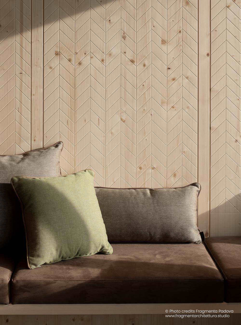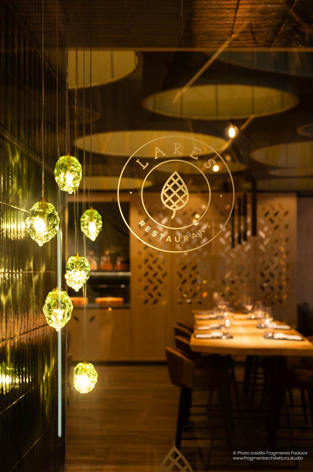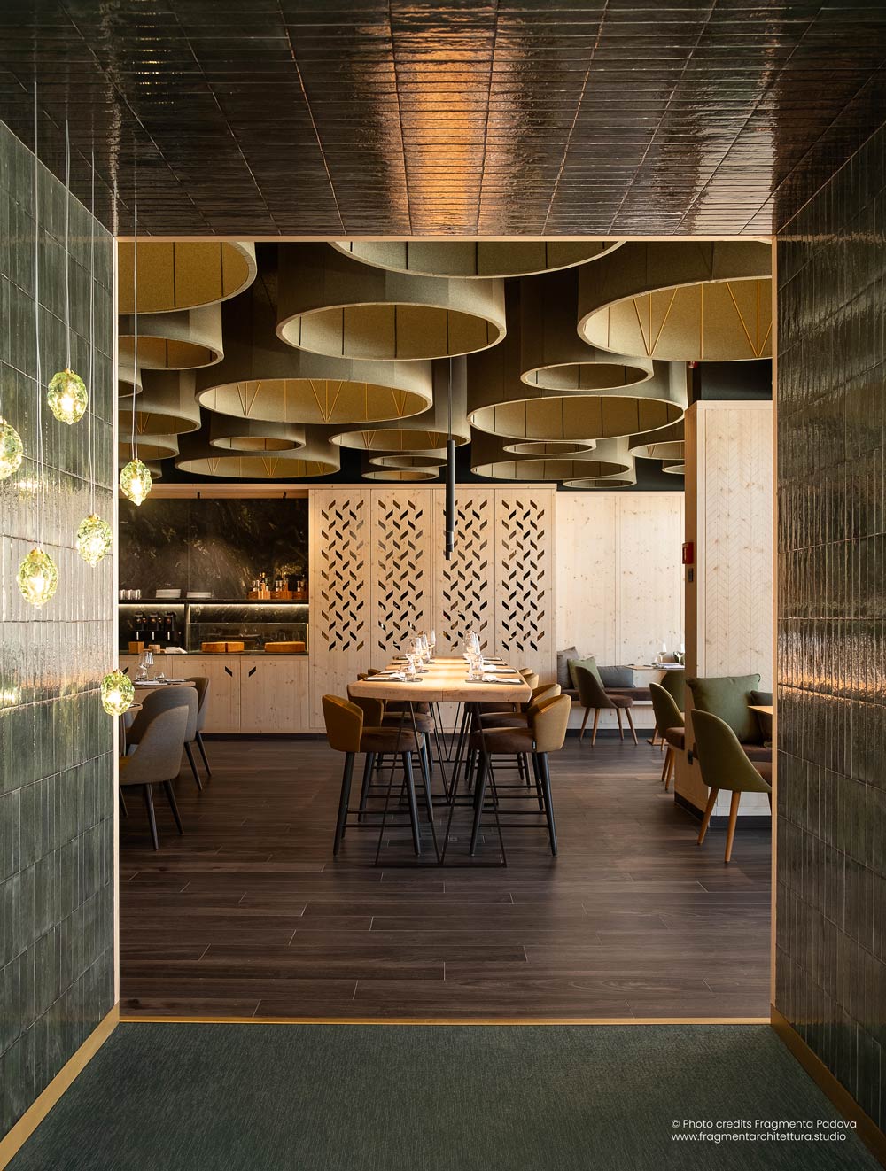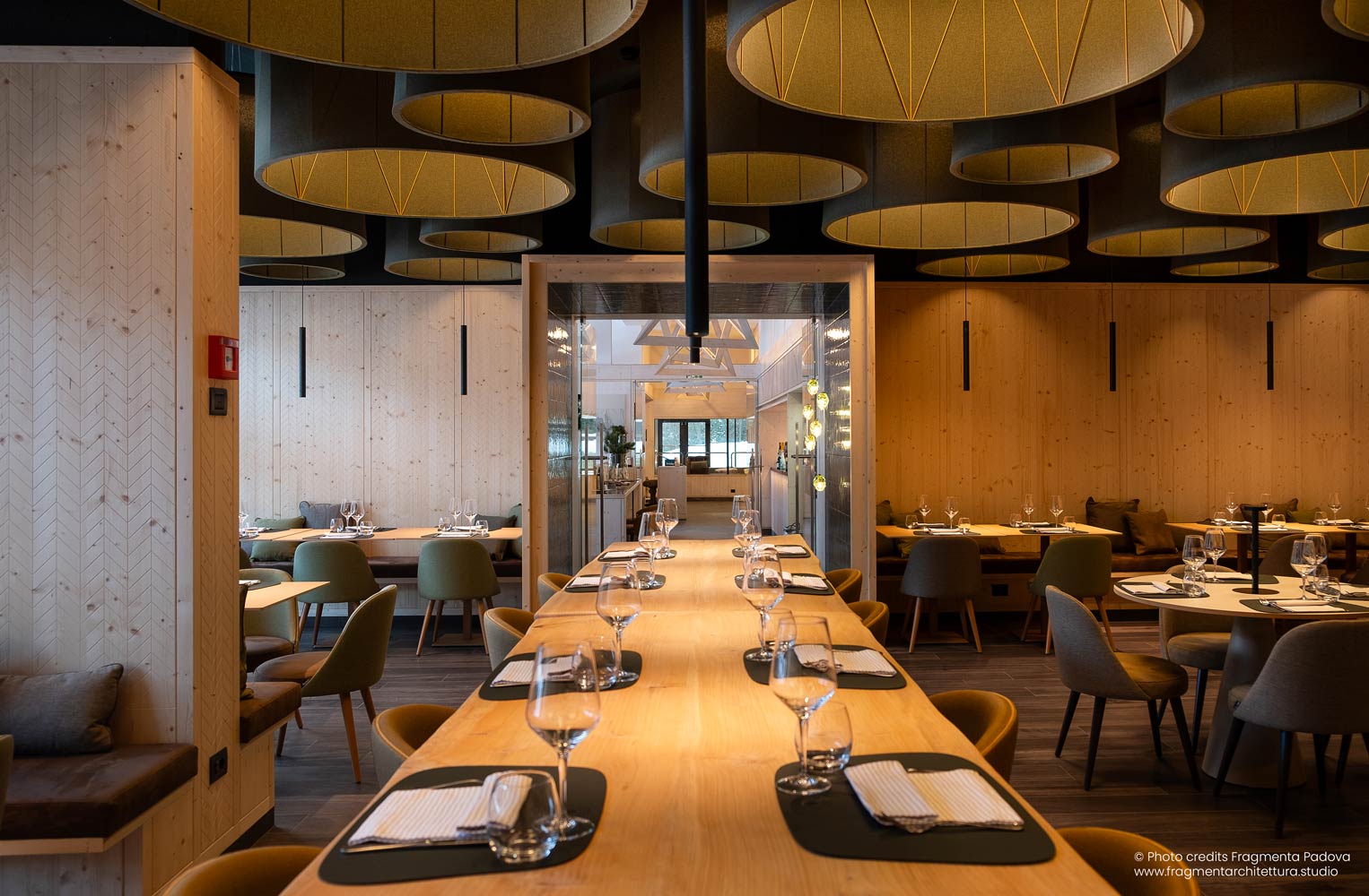 Das Projekt für das Restaurant Lares im Residence Hotel Ambiez in Madonna di Campiglio war eine Herausforderung. Es wurde in enger Zusammenarbeit mit der Architektin Sara Righetto vom Studio Fragmenta in Padua durchgeführt, mit der wir bereits in der Vergangenheit an der Bar- und Rezeptionszone gearbeitet hatten.