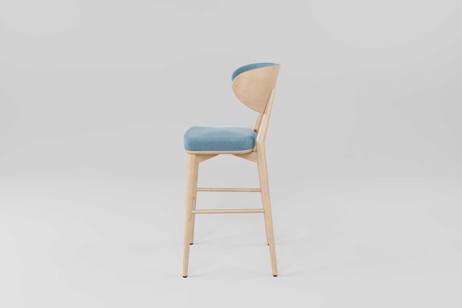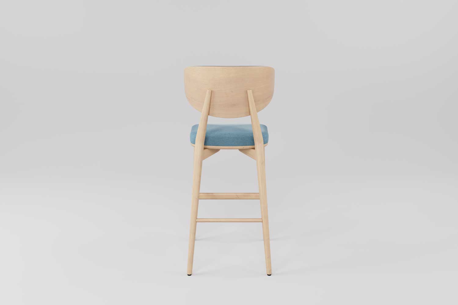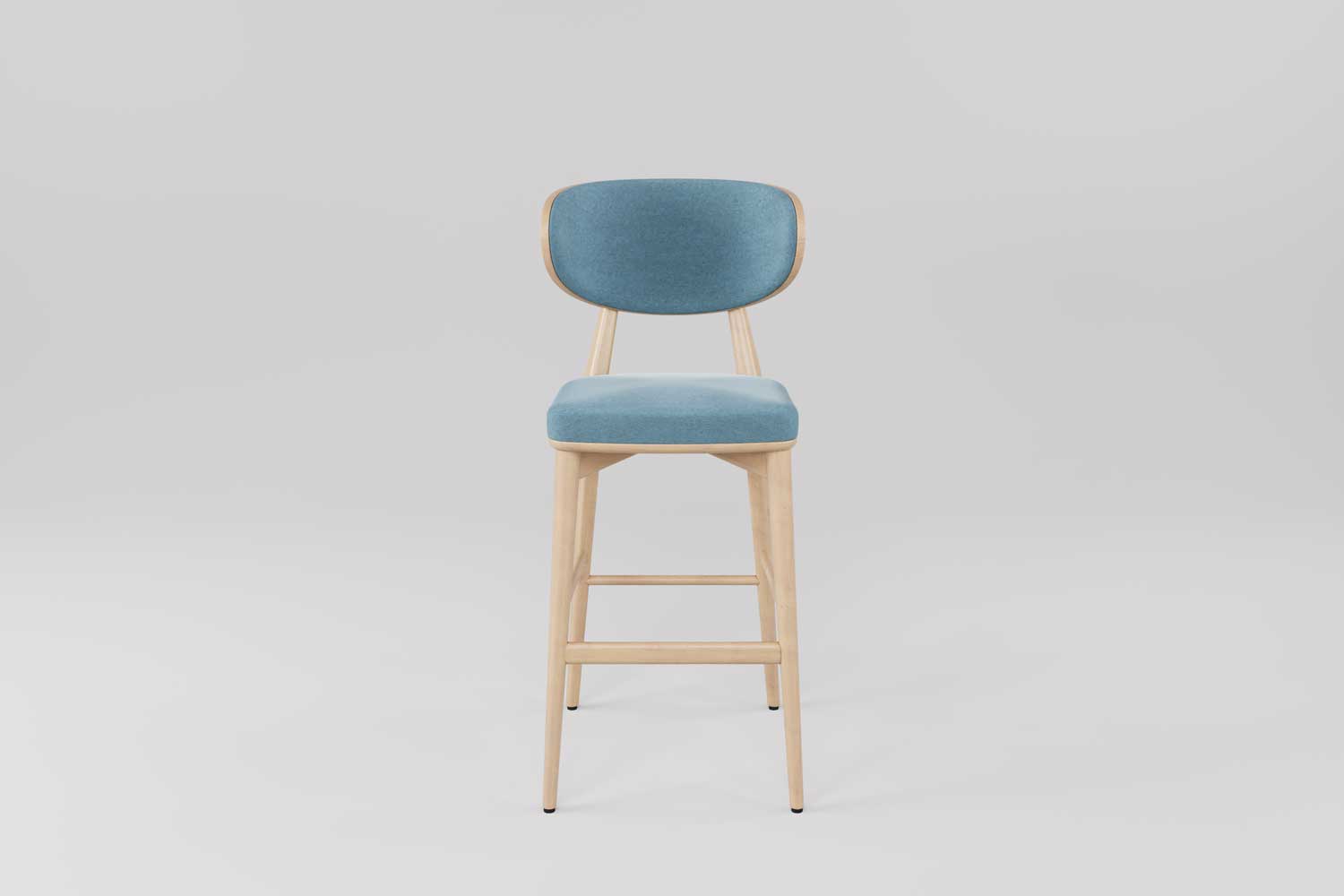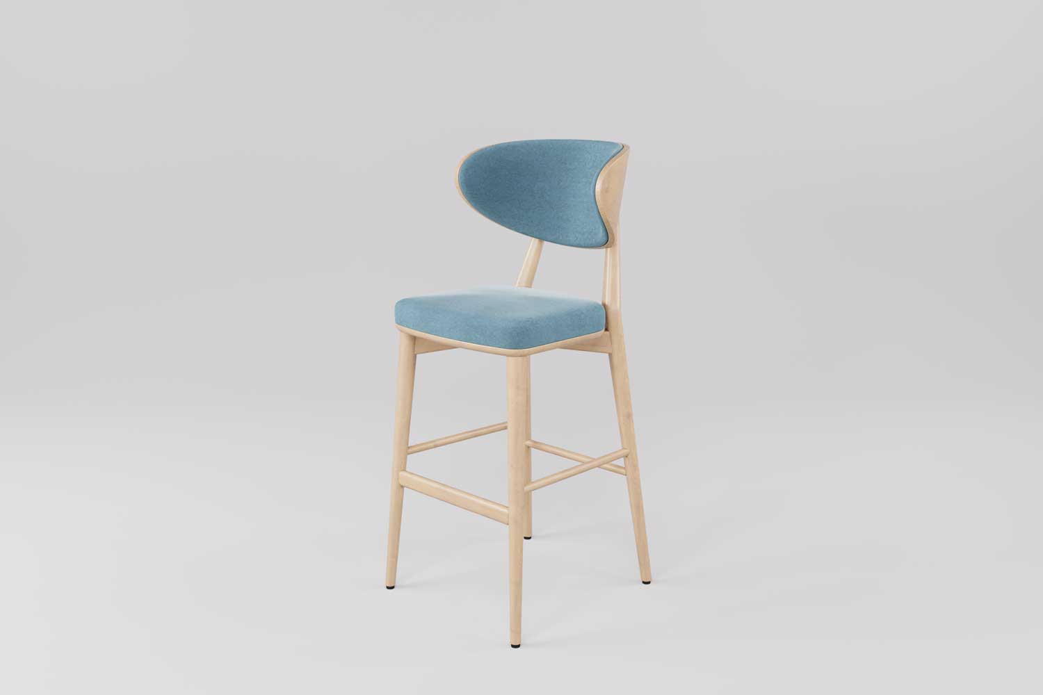 Hocker aus Buchenholz mit gepolsterter Sitzfläche und Rückenlehne, bezogen mit Stoff. Solide Struktur mit integrierter Fußstütze, ideal für Bars, Restaurants und Hotels. Komfort und Widerstandsfähigkeit mit einem modernen und eleganten Stil.