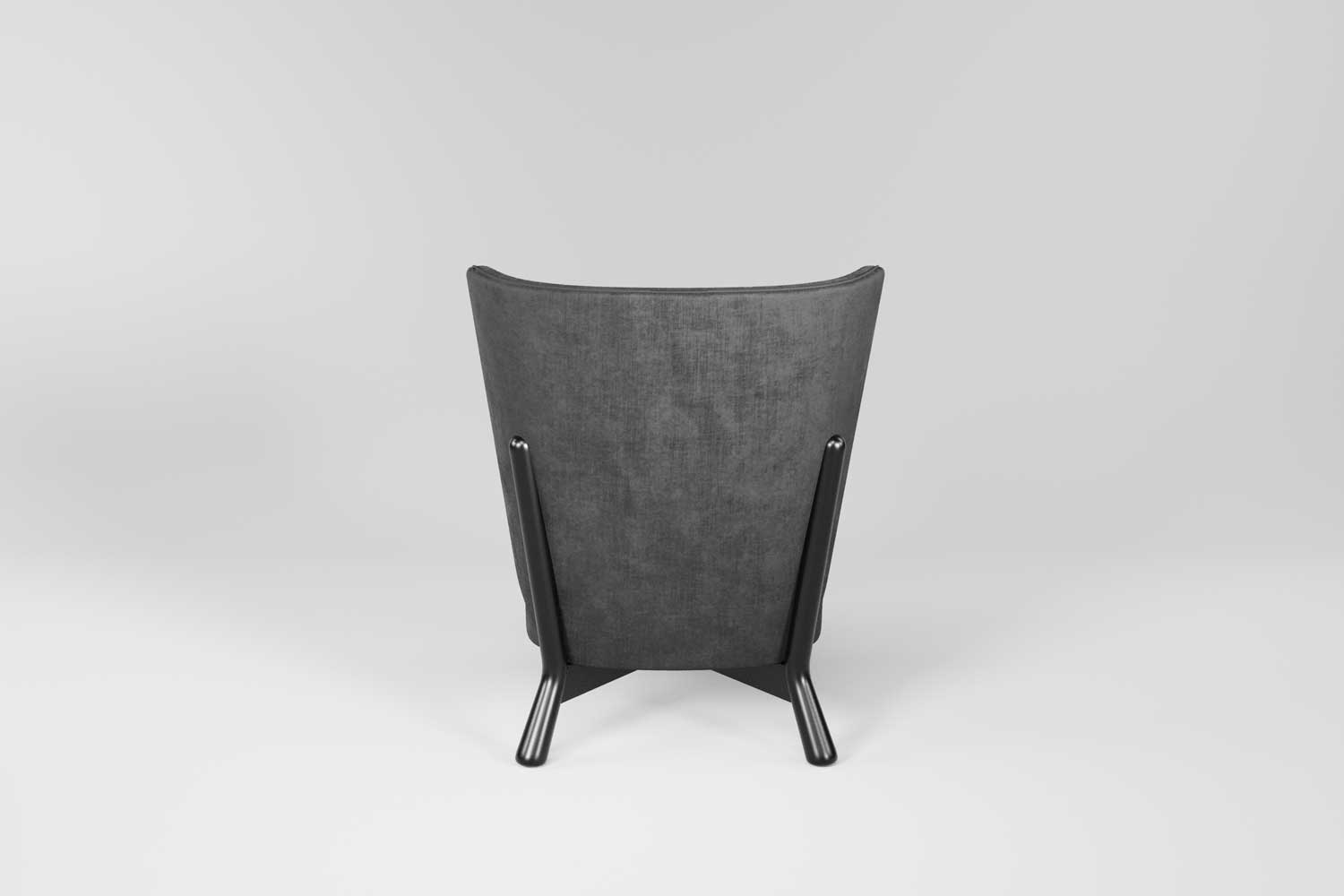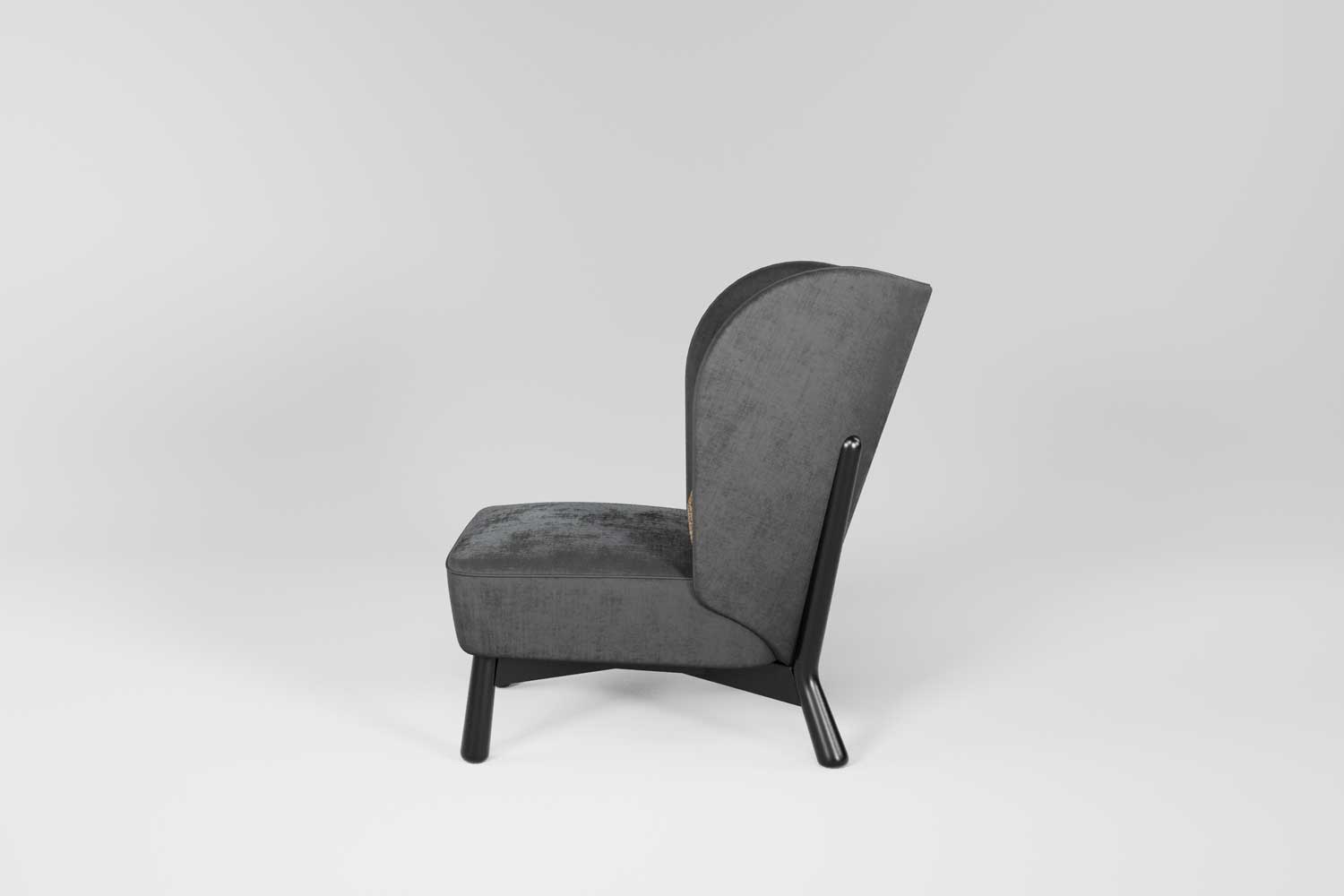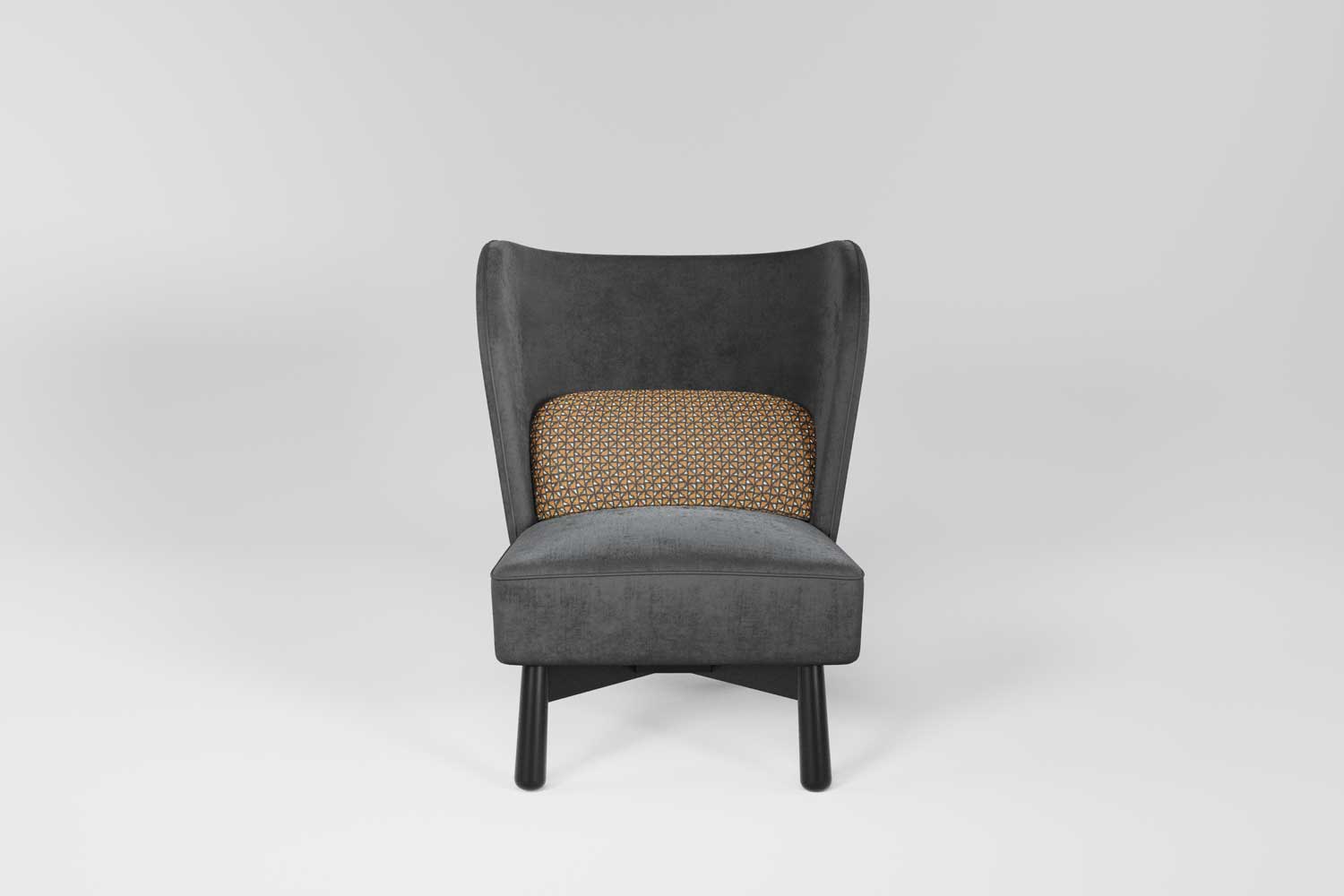 Gepolsterter Sessel mit Massivholzgestell, gekennzeichnet durch eine hohe, geformte Rückenlehne. Das dekorative Stoffdetail verleiht ihm eine besondere Note. Ideal für Empfangshallen, Lounges und Gastronomiebereiche.