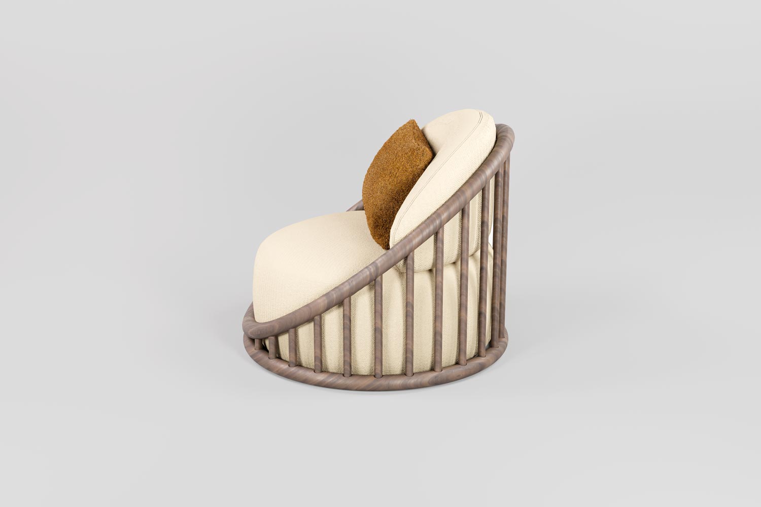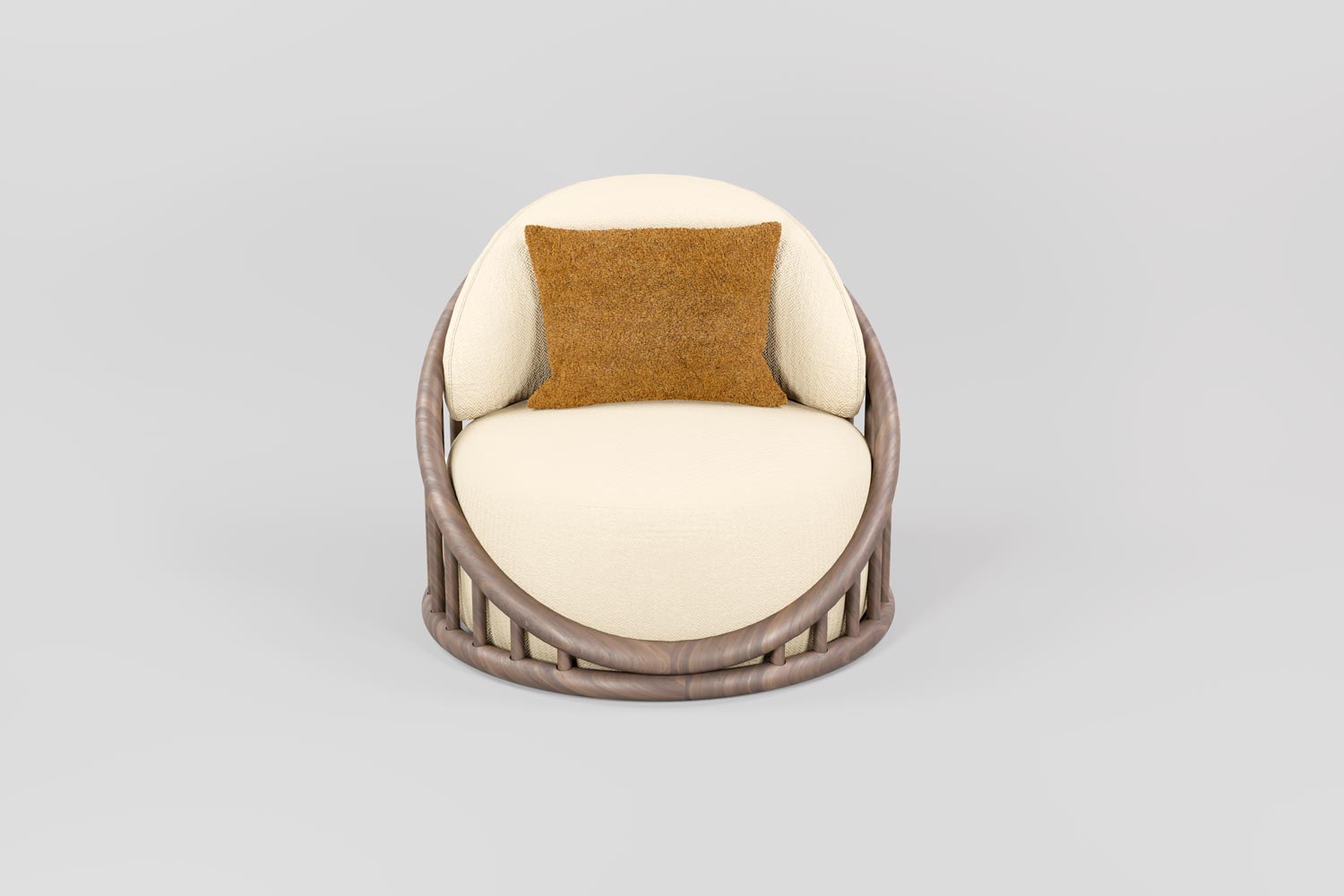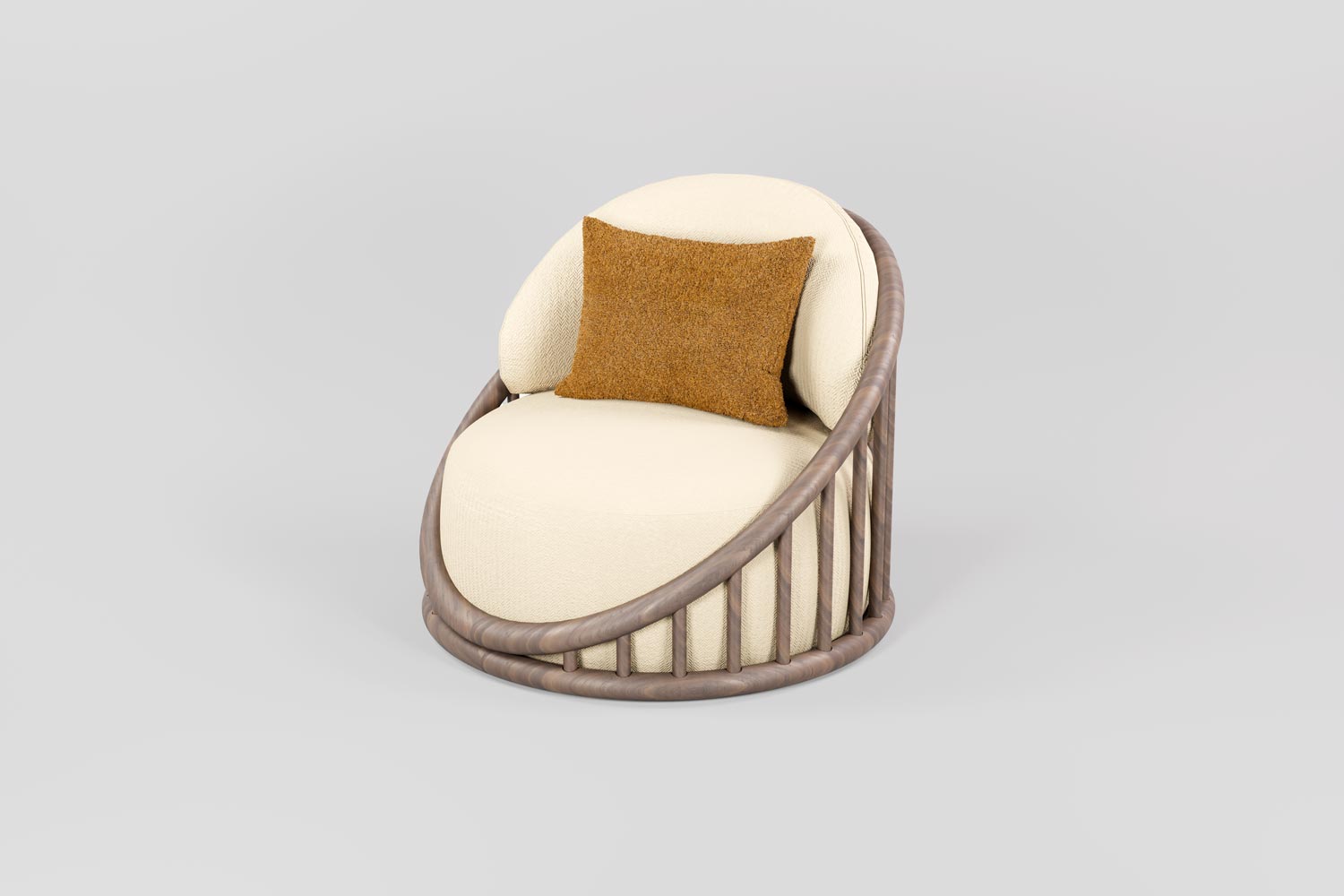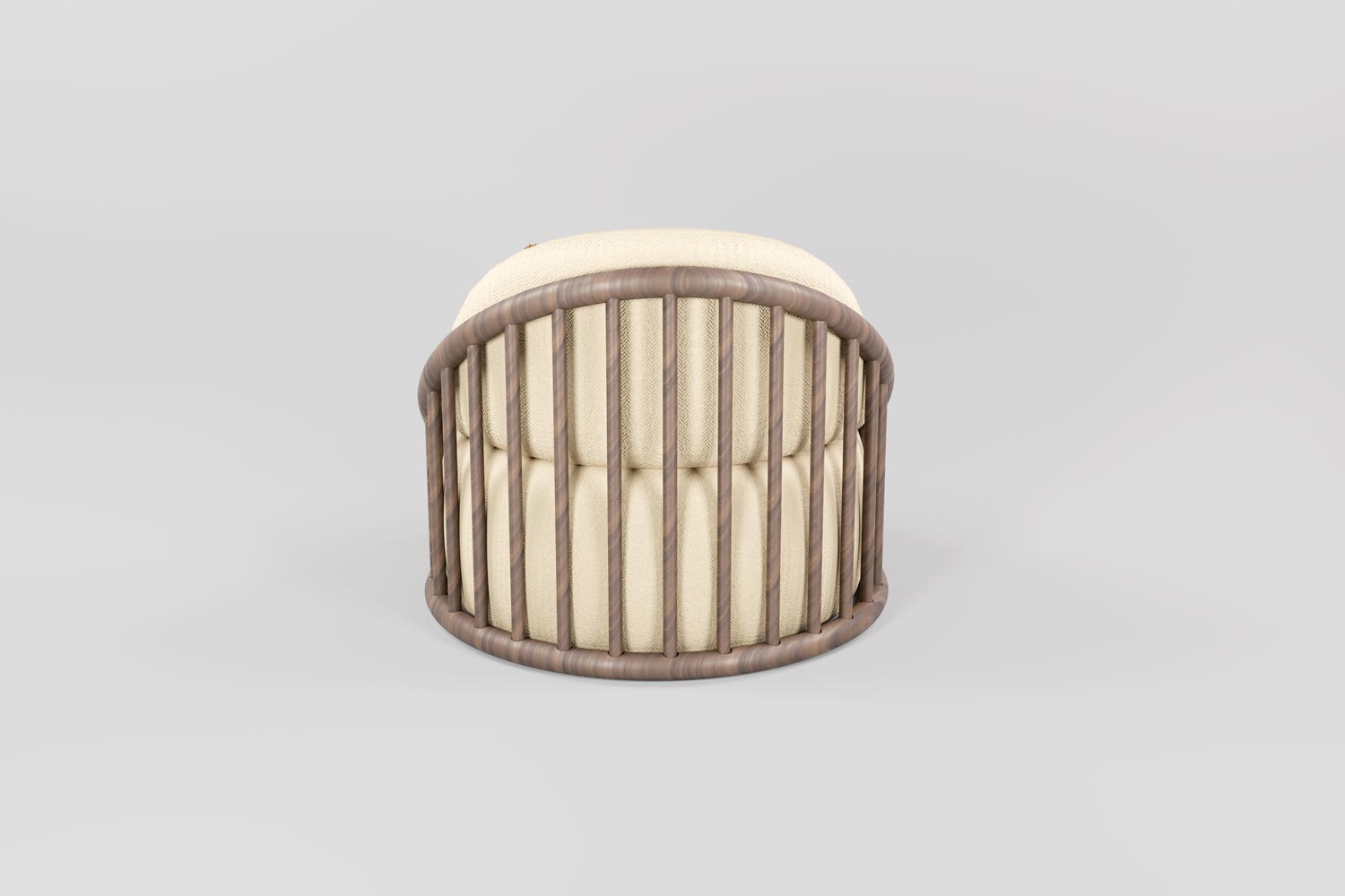 Outdoor-Sessel mit elegantem und geschwungenem Design, gefertigt aus wetterbeständigem Iroko-Holz. Er wurde für die Entspannung im Freien konzipiert und passt perfekt in exklusive Bereiche wie Lounges, Hotels, Spas und Panoramaterrassen.